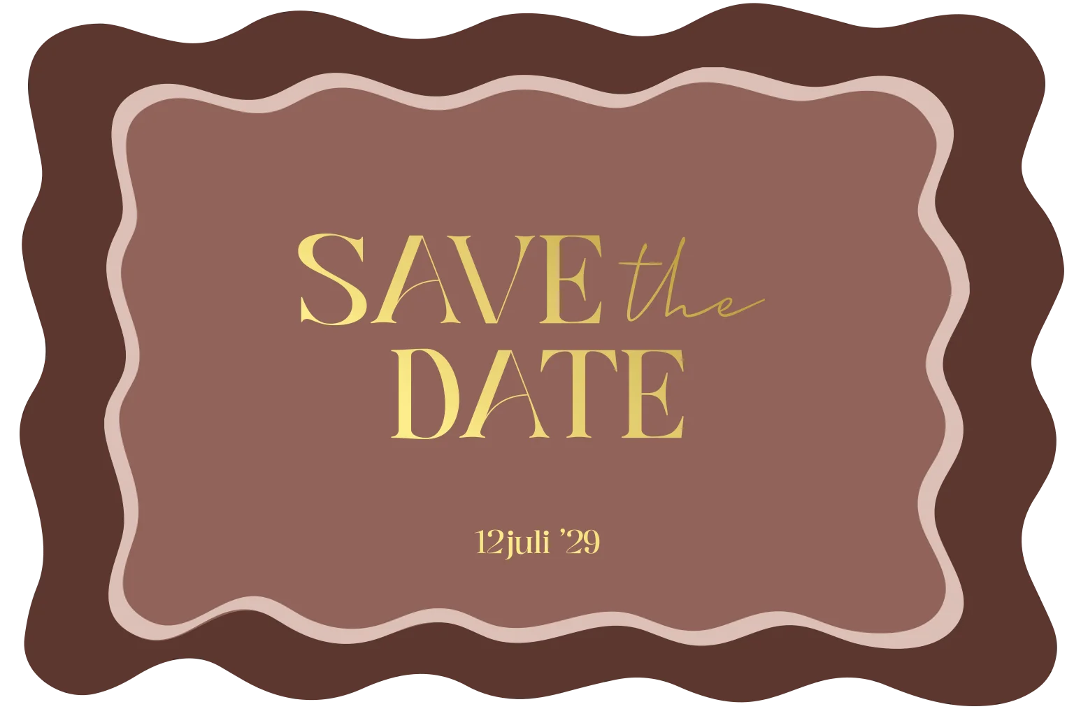 Deze Save the date kaart met golvende vormen in rood bruine kleur met roze en tekst in goudfolie kun je zelf helemaal aanpassen naar smaak.