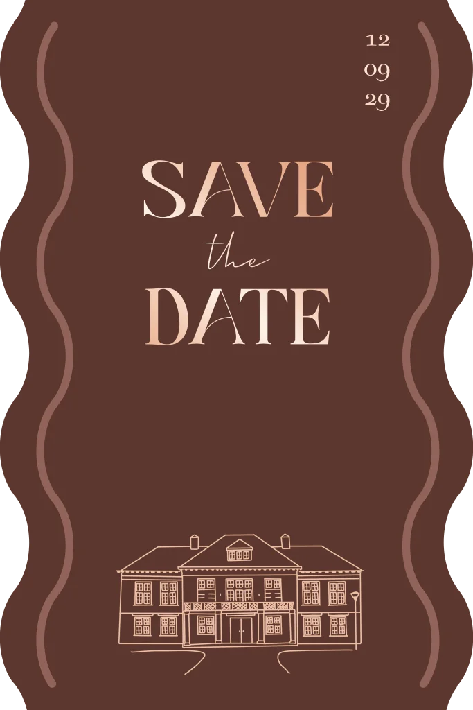 Deze stijlvolle Save the Date-kaart heeft een unieke, organisch golvende rand die het ontwerp een speels en modern karakter geeft. Uitgevoerd in een warm kleurenpalet van rood-, bruin- en zachtroze tinten straalt het kaartje meteen sfeer uit.