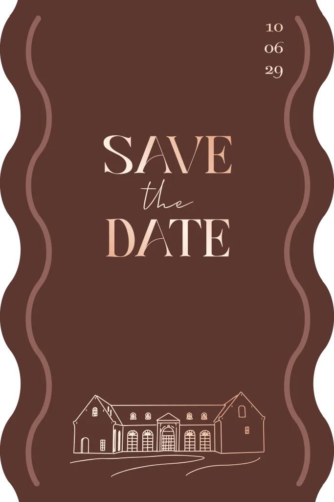 Deze stijlvolle 'save the date' kaart heeft een unieke, originele golvende organische rand die het een speels en modern karakter geeft. Uitgevoerd in een warm kleurenpalet van rood, bruin en zachte roze tinten, straalt het kaartje direct sfeer uit. De toevoeging van een subtiele illustratie van de trouwlocatie, Molen De Zwaluw, maakt het geheel heel persoonlijk. Deze kaart is volledig naar wens aan te passen, zodat de uitnodiging perfect aansluit bij de stijl van jullie bruiloft.