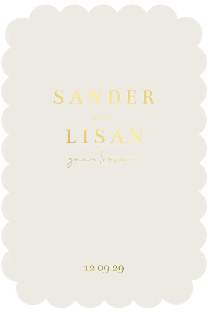 Trouwkaart klassiek golvende koekjes vorm beige met goudfolie