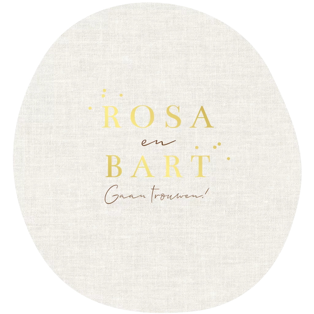 Een klassieke trouwkaart in organische vorm met linnen look achtergrond en de naam en stipjes in goudfolie druk.