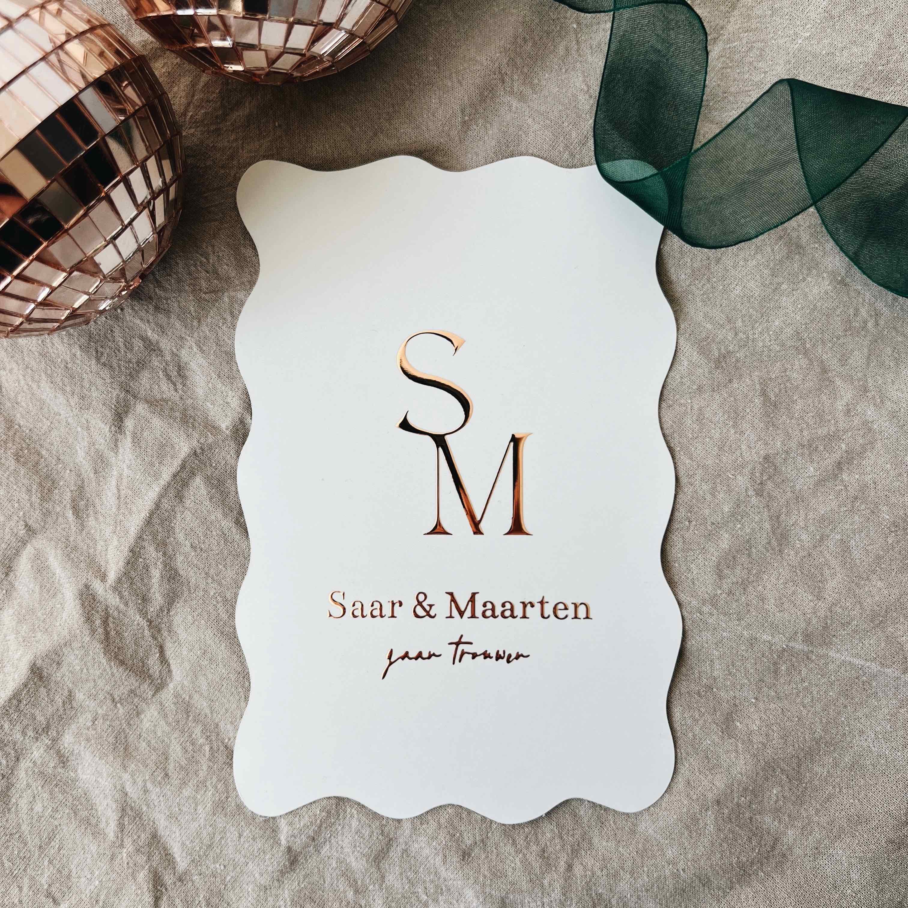 Trouwkaart met organische golvende vormen rosefolie initialen