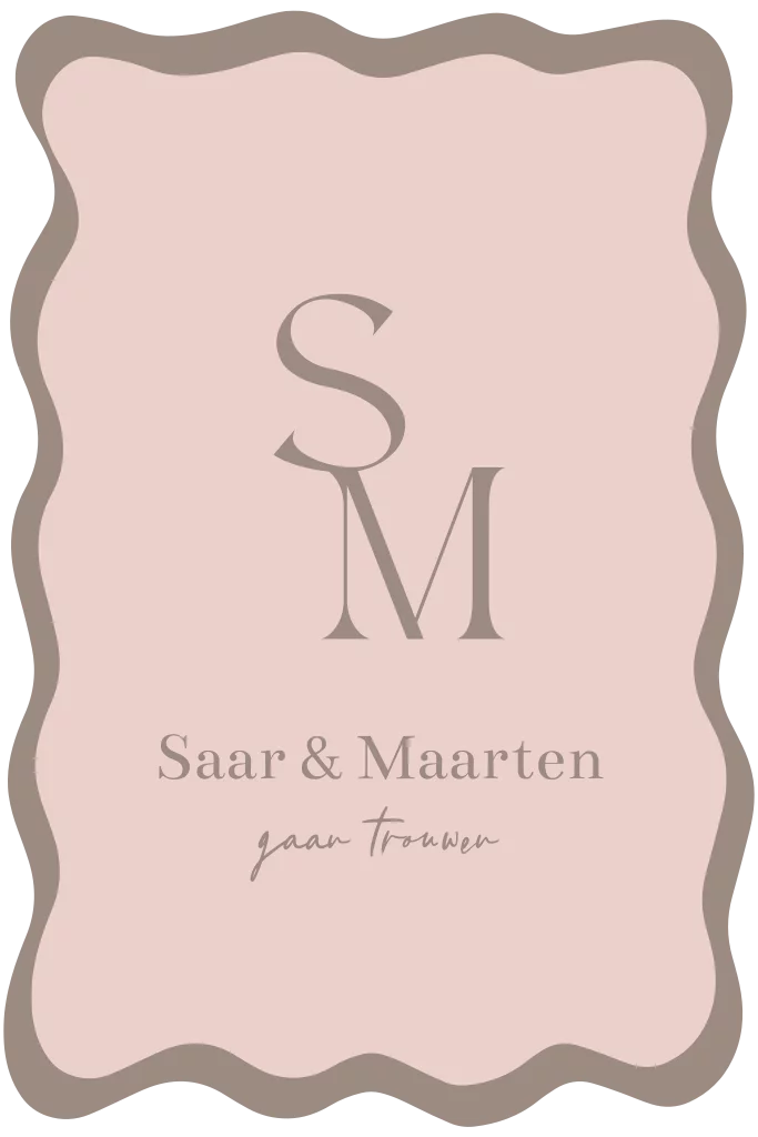 Trouwkaart met organische vormen en initialen roze en bruin
