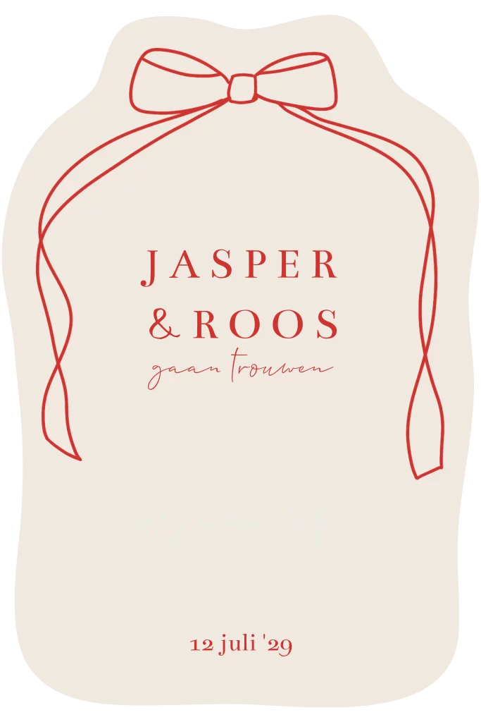 Trouwkaart met rode strik erop in de vorm van een strik roze