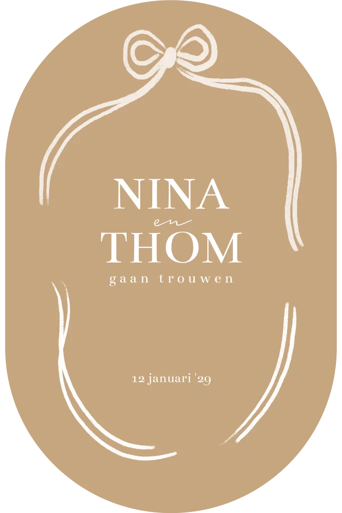 Deze ovalen trouwkaart met een nonchalant hangend strikje in witte kleuren en oranje oker achtergrond kun je zelf aanpassen naar wens en smaak.