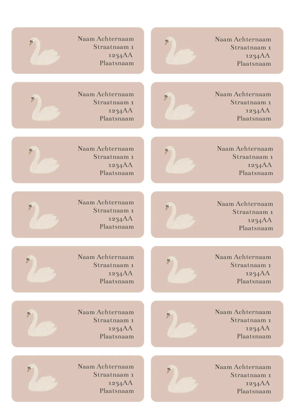 Adressticker kaartje zwaan op roze