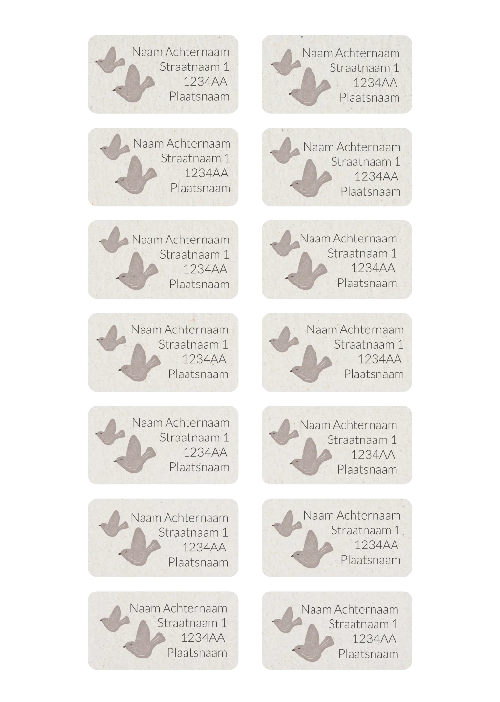 Deze leuke adresstickers horen bij het geboorte kaartje Linde. Je zou dit ontwerp met duifjes, lettertype en achtergrond volledig kunnen aanpassen naar je eigen smaak.