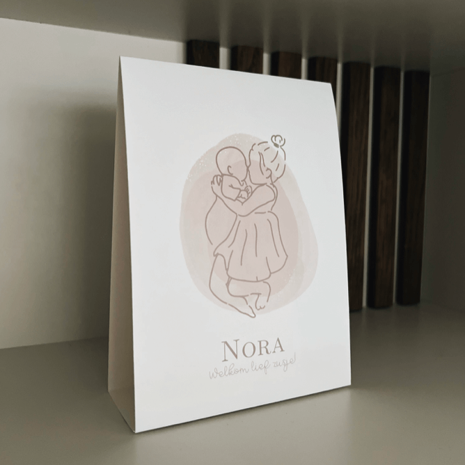 Een lief geboortekaartje voor een meisje met een lijntekening van twee zusjes die elkaar vasthouden. In onze editor vind je nog veel meer verschillende tekeningen en andere gezinssamenstellingen.