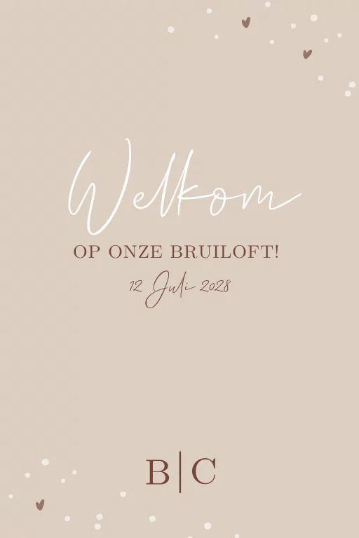 Met dit welkoms bord heet je iedereen welkom op jullie trouwdag. Je kunt dit bord helemaal aanpassen naar wens.