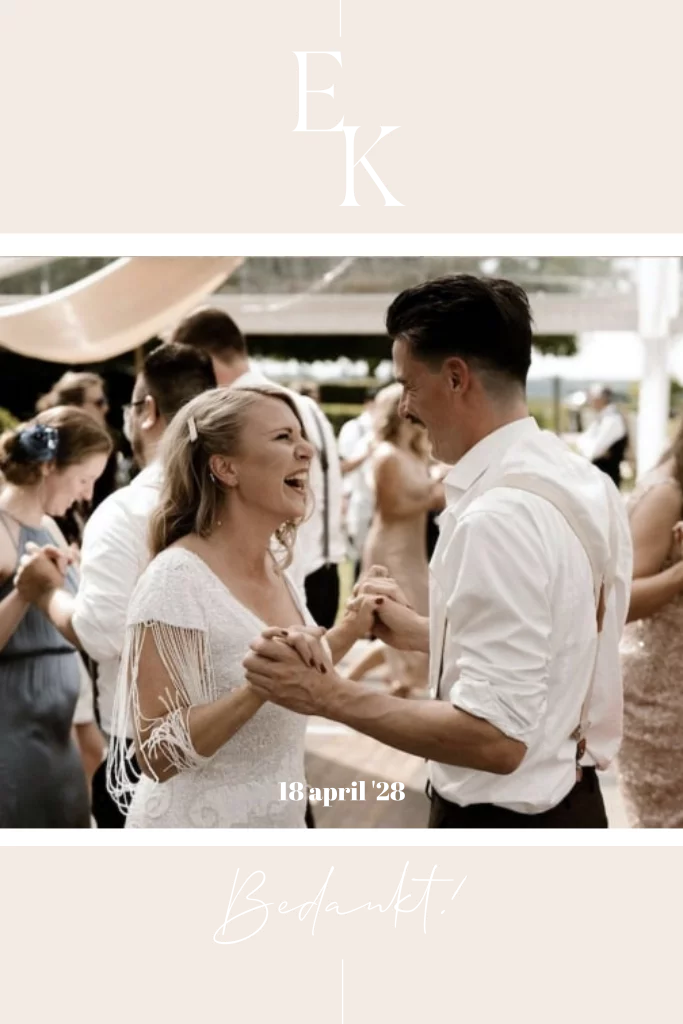 Deze mooie minimalistische bedankkaart kun je zelf aanpassen naar wens met foto's van jullie bruiloft om alle gasten te bedanken voor de leuke dag :)