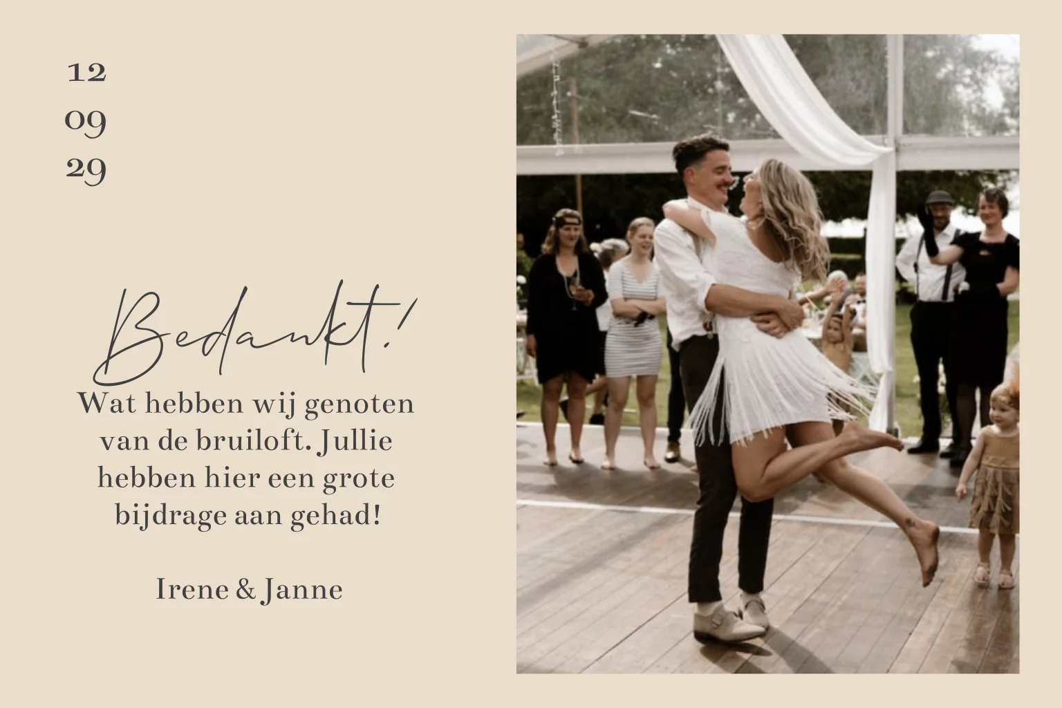 bedankkaartje om de daggasten te versturen met foto bruiloft beige