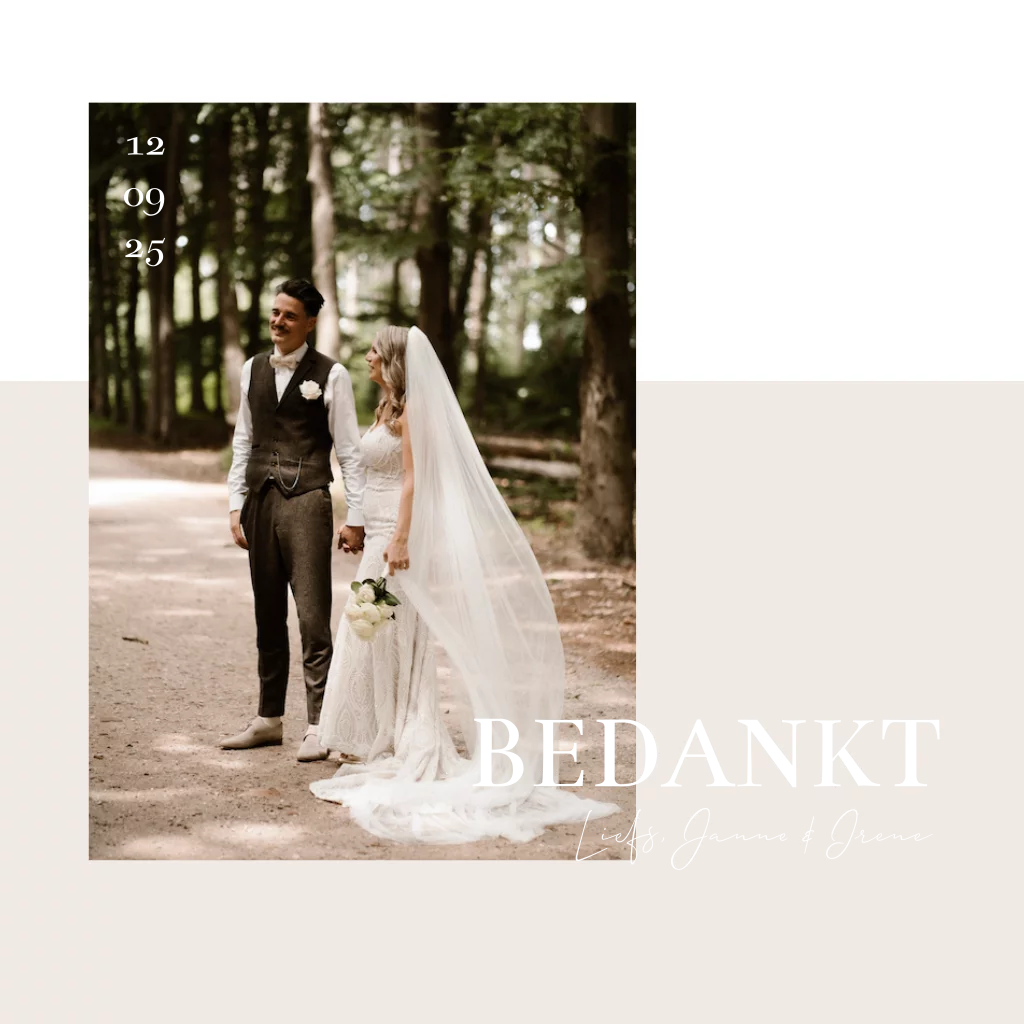Deze bedankkaart kun je zelf aanpassen naar smaak en wens en natuurlijk met een mooie trouwfoto van jullie zelf. Ook zo de gasten nog even na te laten genieten van jullie mooie dag.