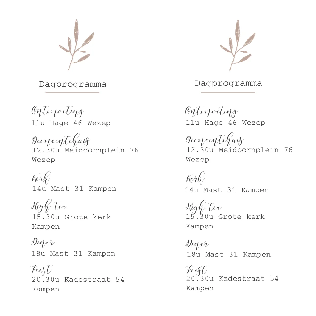 Met een dagprogramma zien de gasten precies op welk moment ze waar moeten zijn. Deze past heel mooi bij de hele trouwhuisstijl