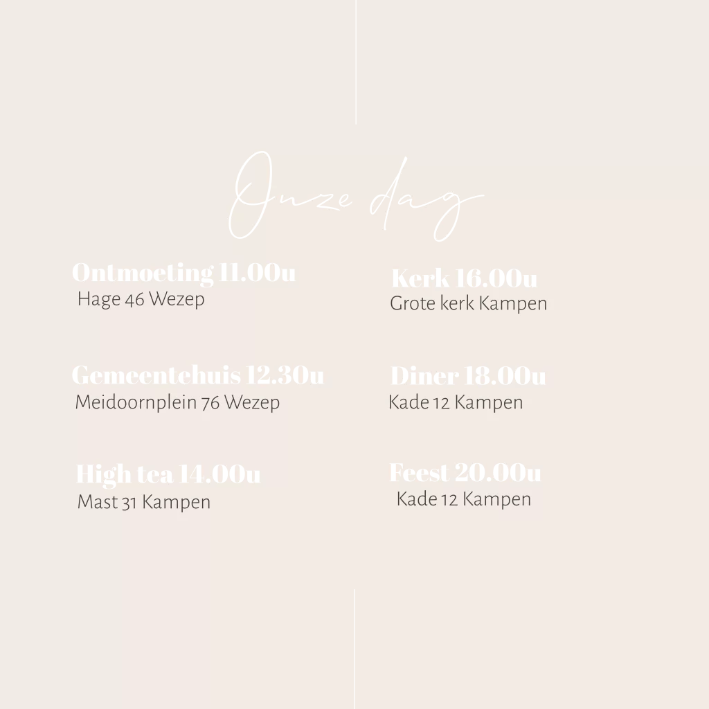 Met dit dagprogramma kaartje geef je de gasten op jullie bruiloft alvast een inkijkje in de dag.
