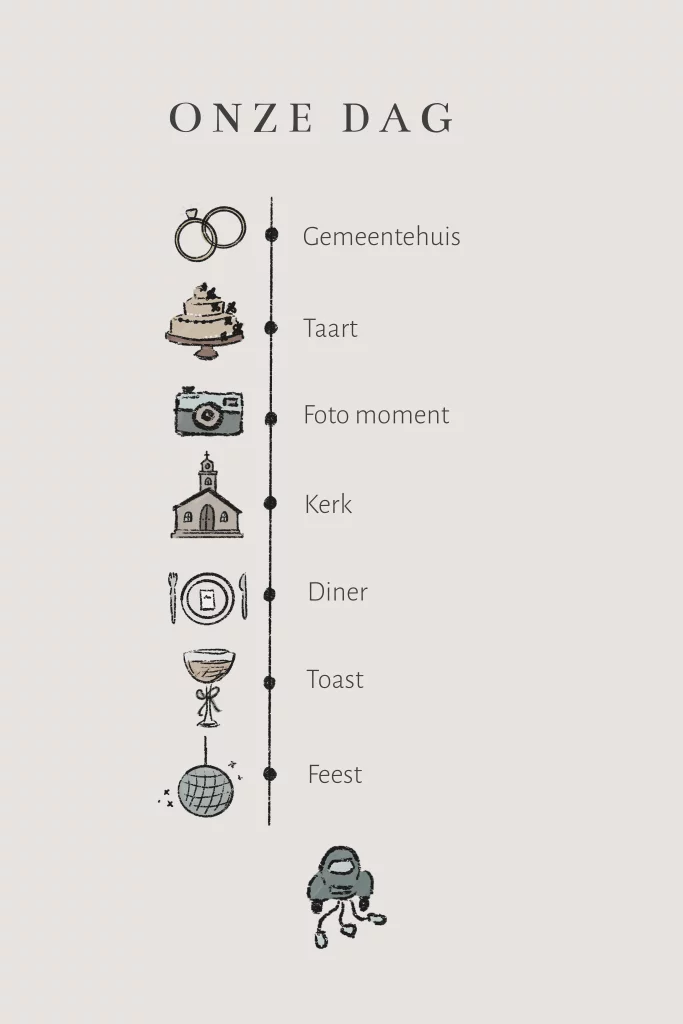 Hoe tof om een dagprogramma voor jullie bruiloft mee te sturen naar jullie daggasten zodat zij precies weten waar ze aan toe zijn op deze mooie dag.