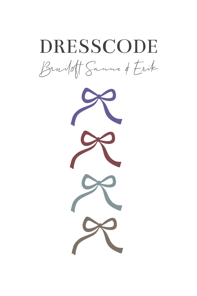 Deze dresscode kaartje met strikjes kun je aanpassen naar wens en smaak voor jullie gasten op de bruiloft.