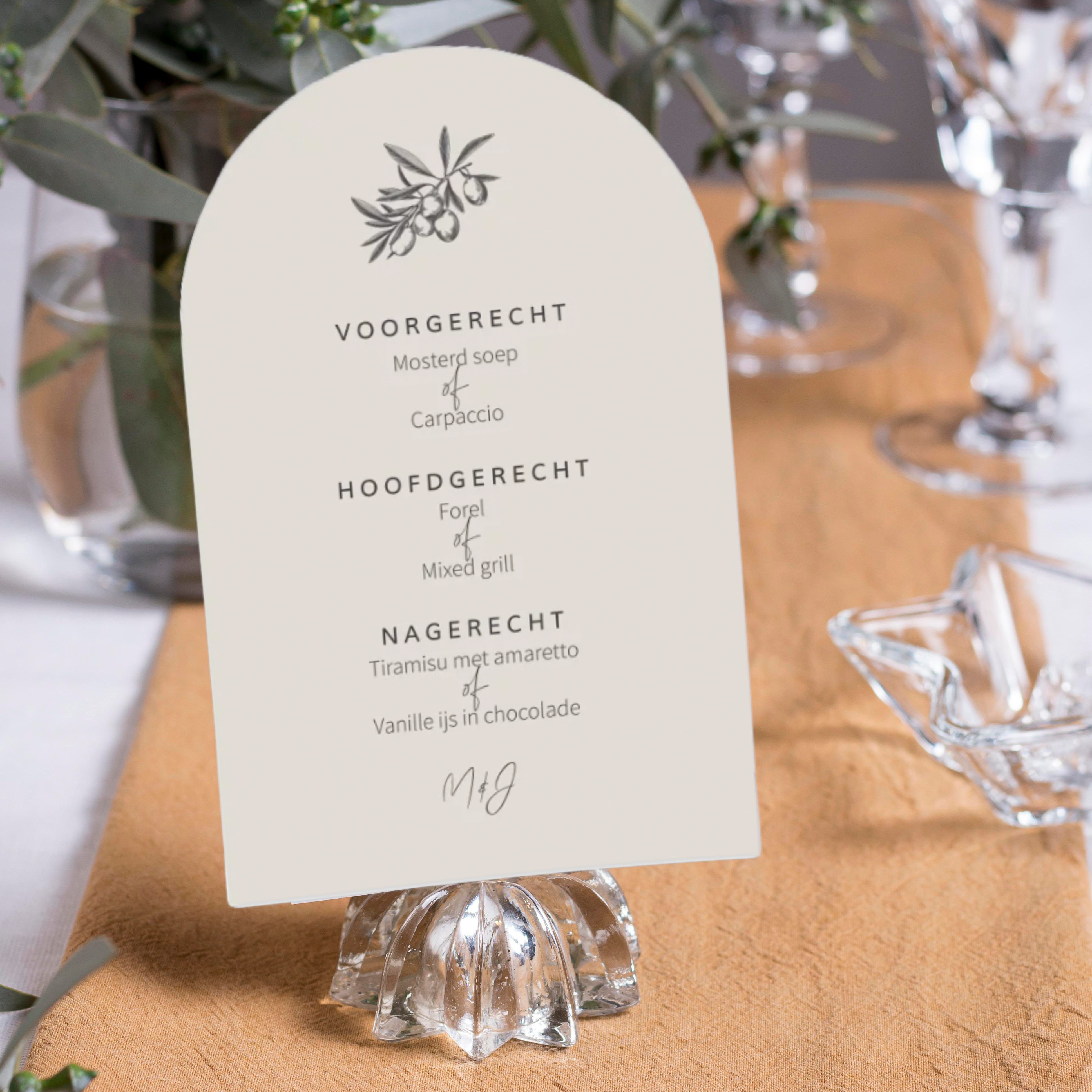 Menukaart met olijftakje bruiloft passend bij trouwkaart