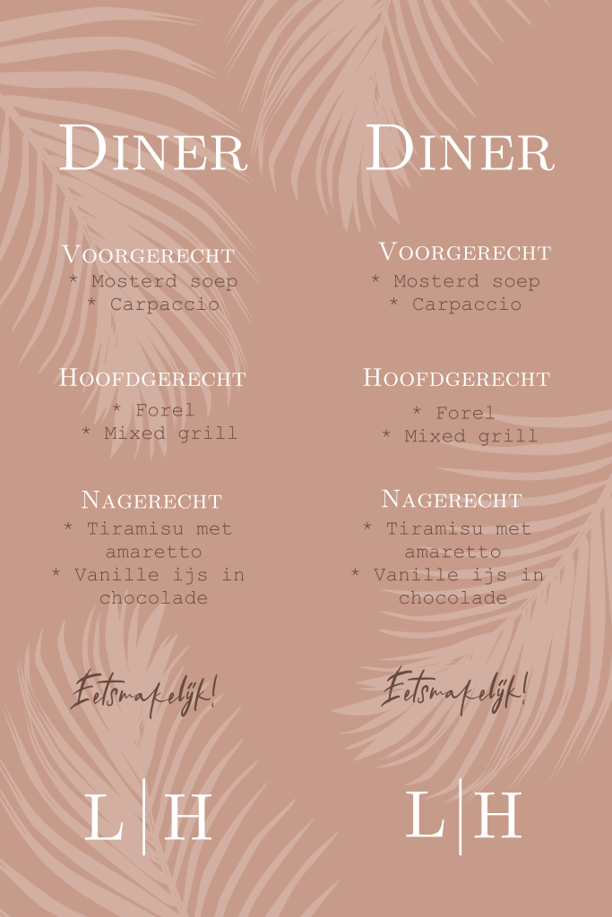 Deze menukaart past bij de trouwkaart met palmboom takken zo heb je een mooi setje voor jullie bruiloft. Je kunt nog meer dingen maken wat past bij jullie trouwhuisstijl. De initialen van jullie naam kun je overal terug laten komen.