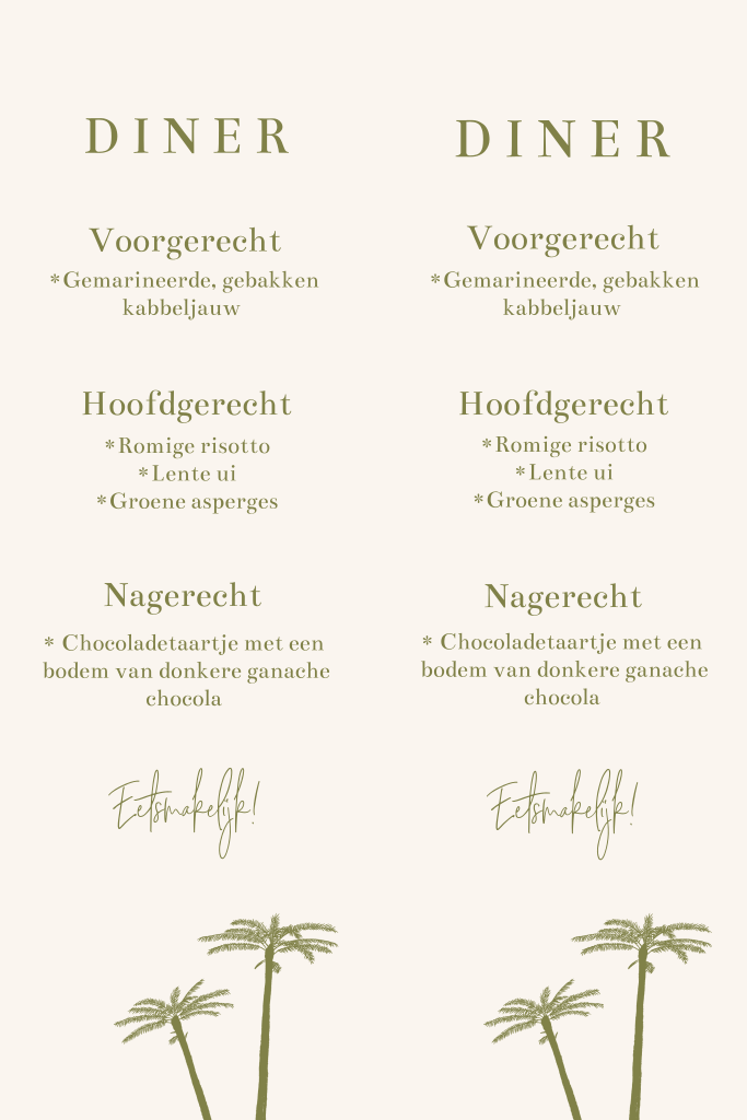 Deze menukaartjes passen perfect bij de trouwhuisstijl met palmbomen. Zijn jullie palmboom fan of echte reisliefhebbers? Dan zit je met deze huisstijl goed. De huisstijl kan naar wens en smaak aangepast worden.