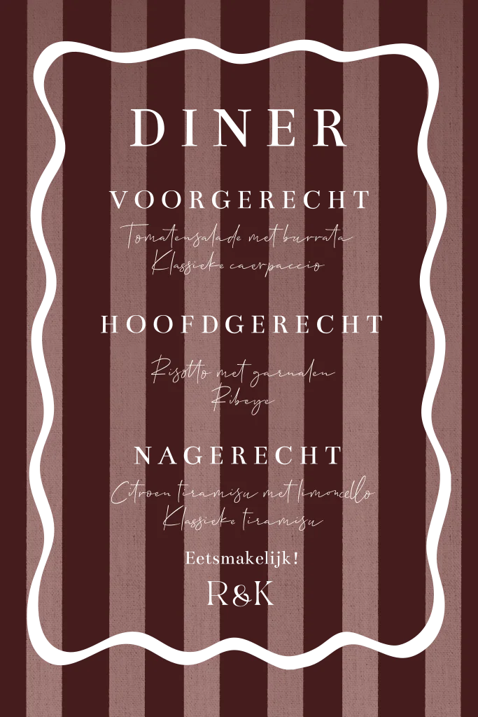Deze stijlvolle menukaart met bordeaux rood-paarsige strepen in combinatie met roze tinten en luxe goudfolie is volledig naar wens aan te passen. Zo sluit de menukaart perfect aan bij de rest van jullie bruiloftsstyling.