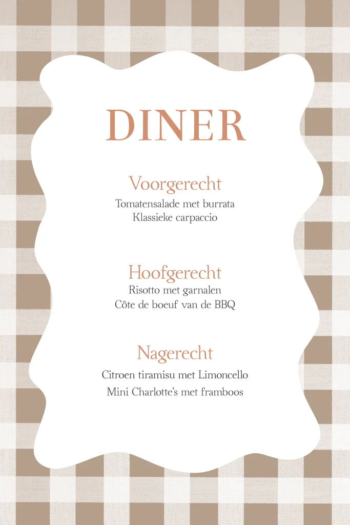 Maak je tafelsetting helemaal af met deze menukaart. De kleuren en lettertypes kun je allemaal aanpassen naar wens en smaak!