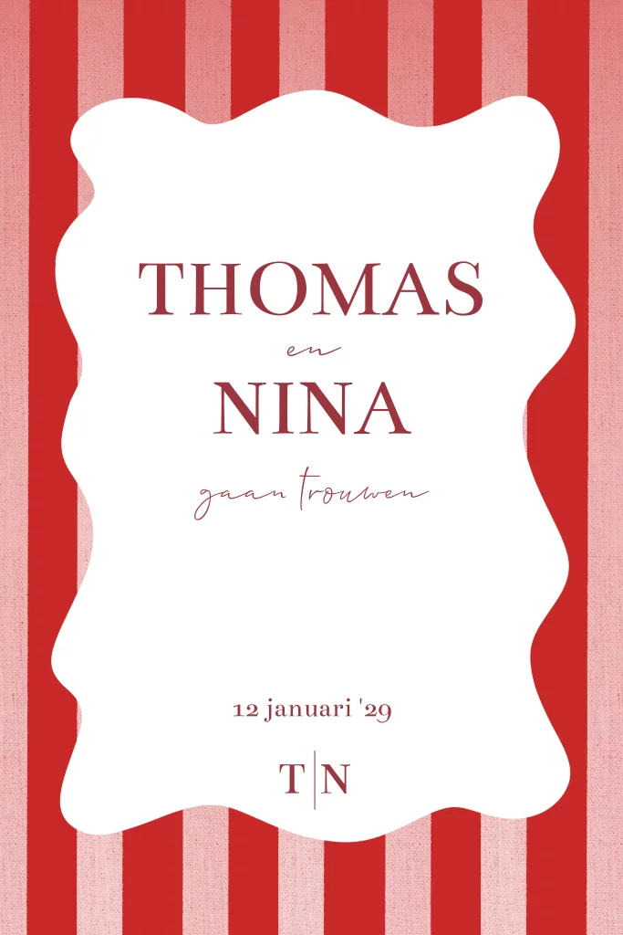Deze vrolijke trouwkaart met fel rode en roze colorblocking strepen kun je zelf helemaal aanpassen naar wens.