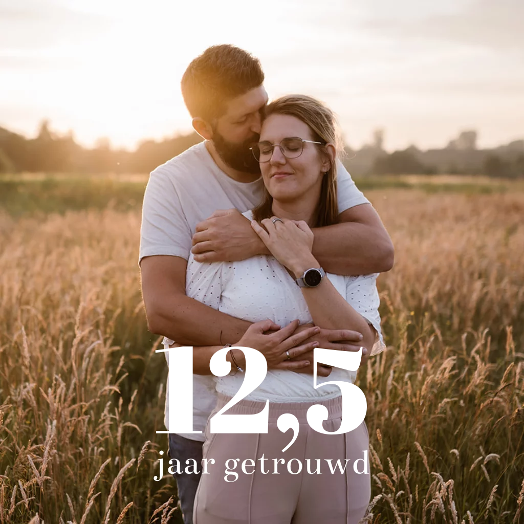 Een dubbele vierkante jubileum kaart voor een 12,5 jarig huwelijks feestje met een mooie foto van jullie samen en eventueel aan de binnenkant een foto van jullie gezin.