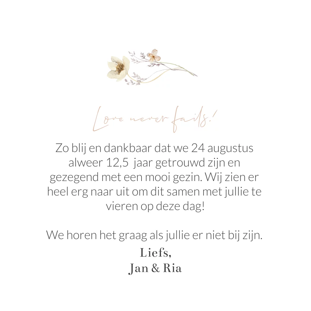 Deze kaart kun je helemaal aanpassen naar wens om zo jullie geliefden uit te nodigen voor het jubileums feestje want natuurlijk kun je het aanpassen naar een 25, 50 of 60 jarig huwelijks kaart.