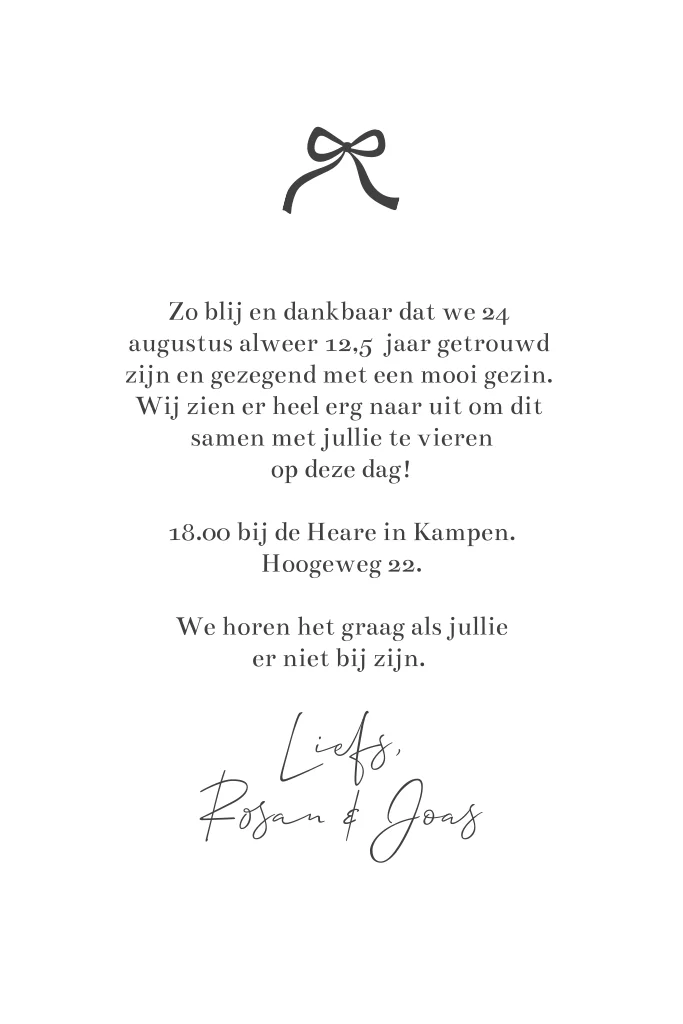 Deze klassieke jubileums kaart minimalistisch met strikje kun je zelf helemaal aanpassen naar wens.