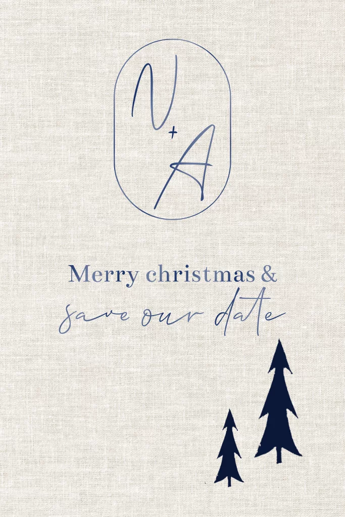Combinatie van een kerstkaart met een save the date. De mooie donkerblauwe kleur in spotlak maakt de kaart extra speciaal, maar is uiteraard ook om te zetten in een andere kleur.