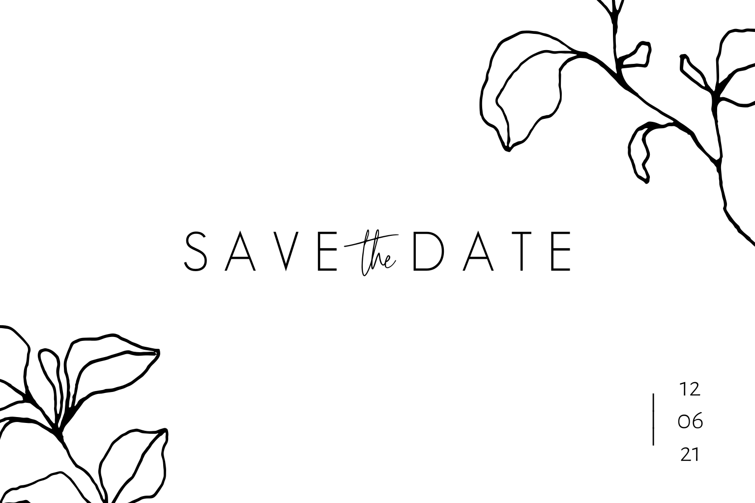 Minimalistische save the date kaart lijntekening bladeren zwart wit
