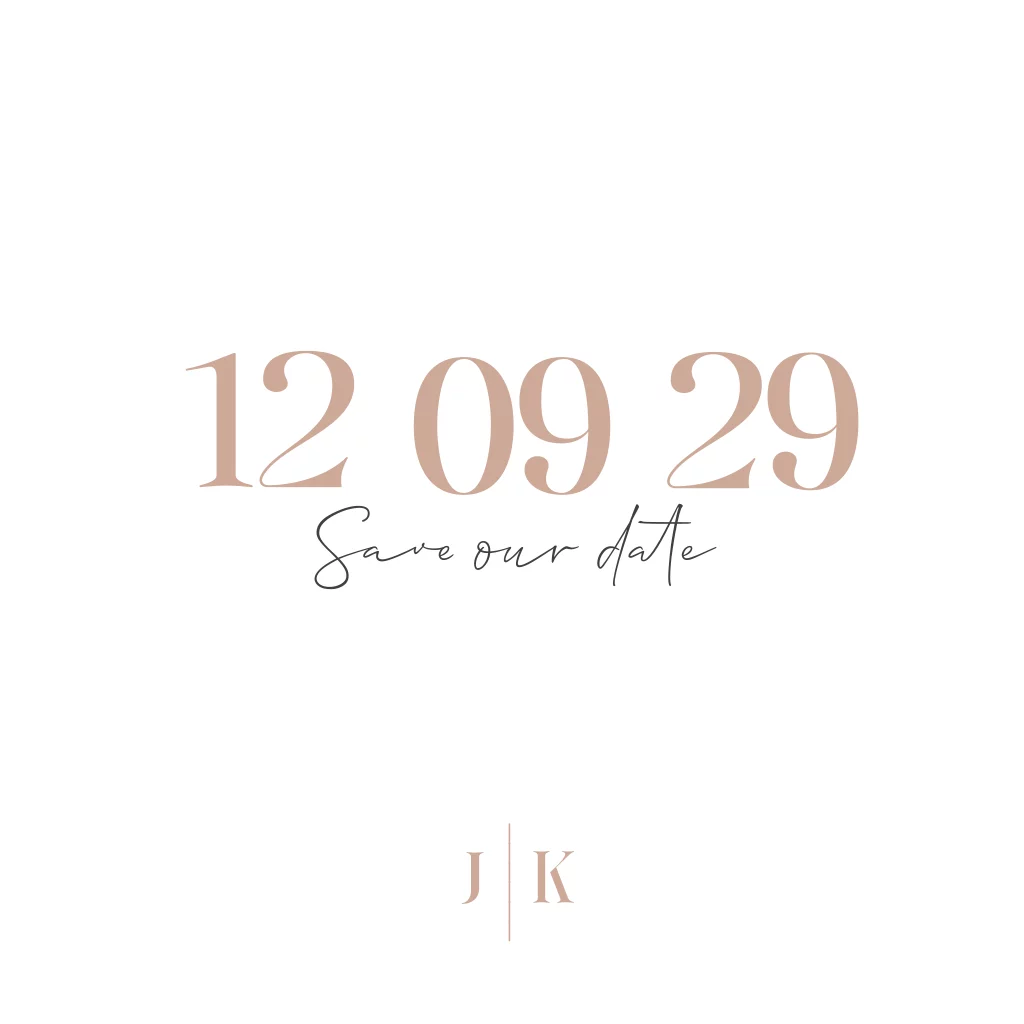 Een minimalistische Save the date kaart met grijs en en datum in roze voorop. Er staat ook al een passende trouwkaart online.