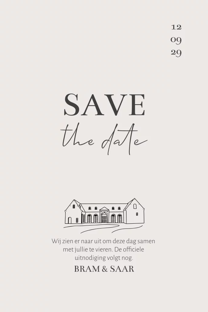 Save the date kaart minimalistisch met lijntekening trouwlocatie