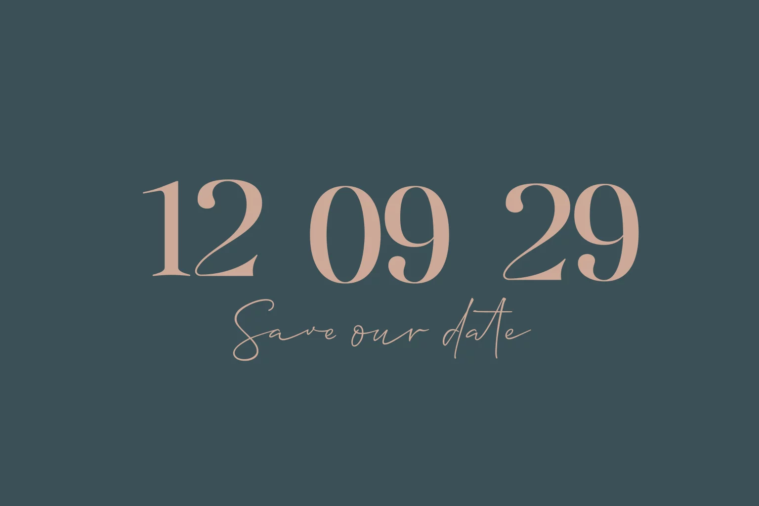 Een minimalistische Save the date kaart met de datum groot voorop in roze en groene achtergrond kun je zelf aanpassen naar wens.