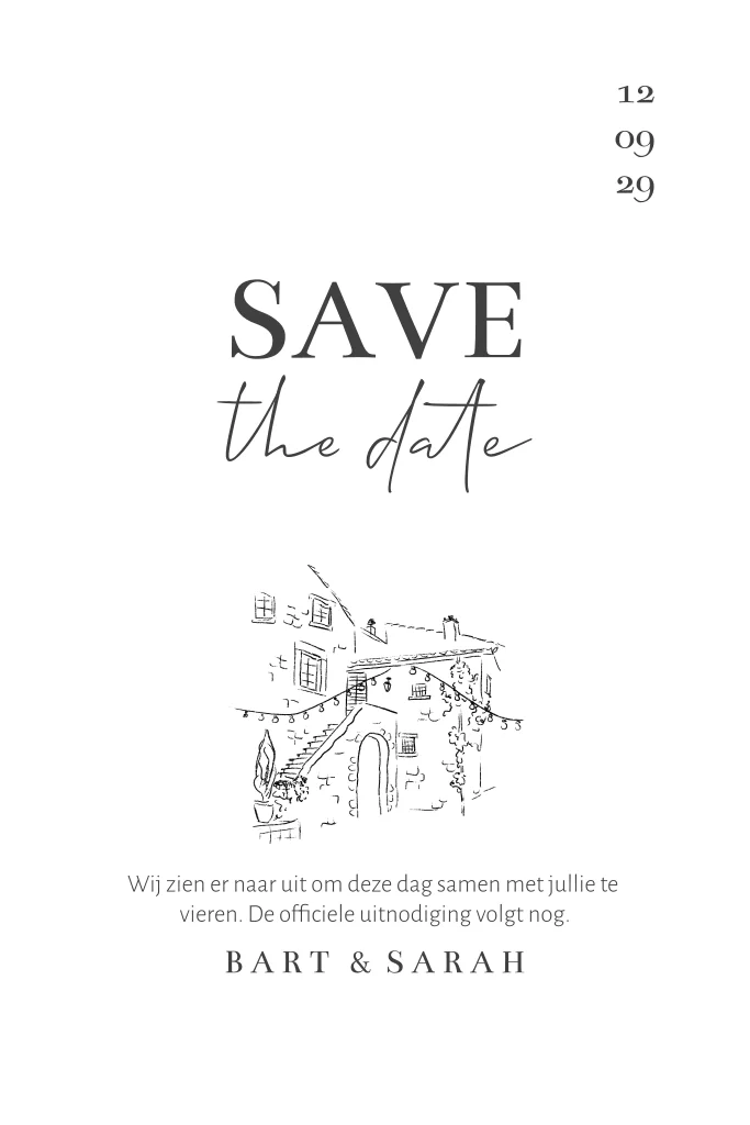 Minimalistische Save the date kaart met trouwlocatie. We kunnen deze tekening ook op maat voor je tekenen.