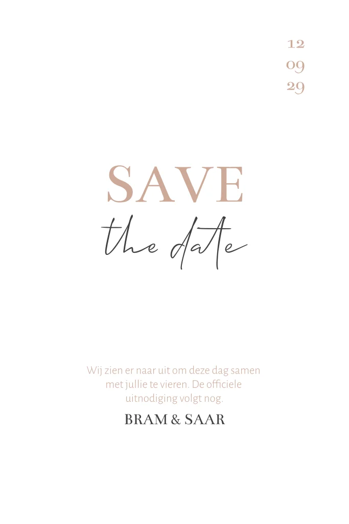 Deze Save the date kaart met roze en grijs kun je aanpassen. Wil je een trouwkaart in dezelfde stijl? Dat kan, we helpen graag.