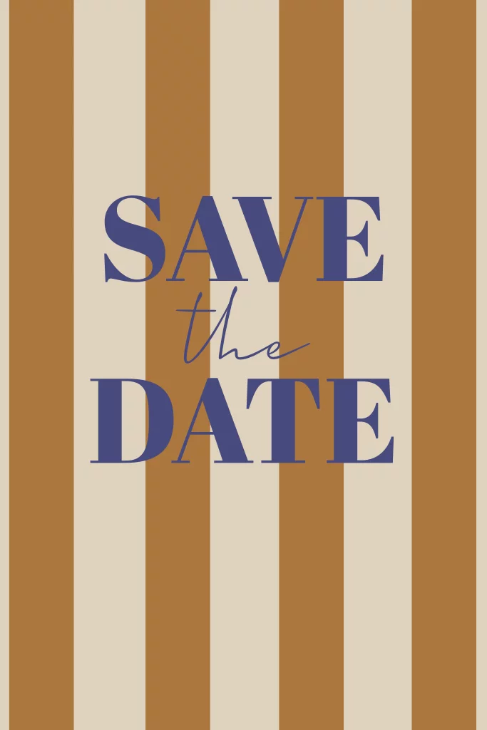 Deze stoere Save the date kaart met oranje oker kleurige strepen in combi met beige en donkerblauw kun je aanpassen naar wens.