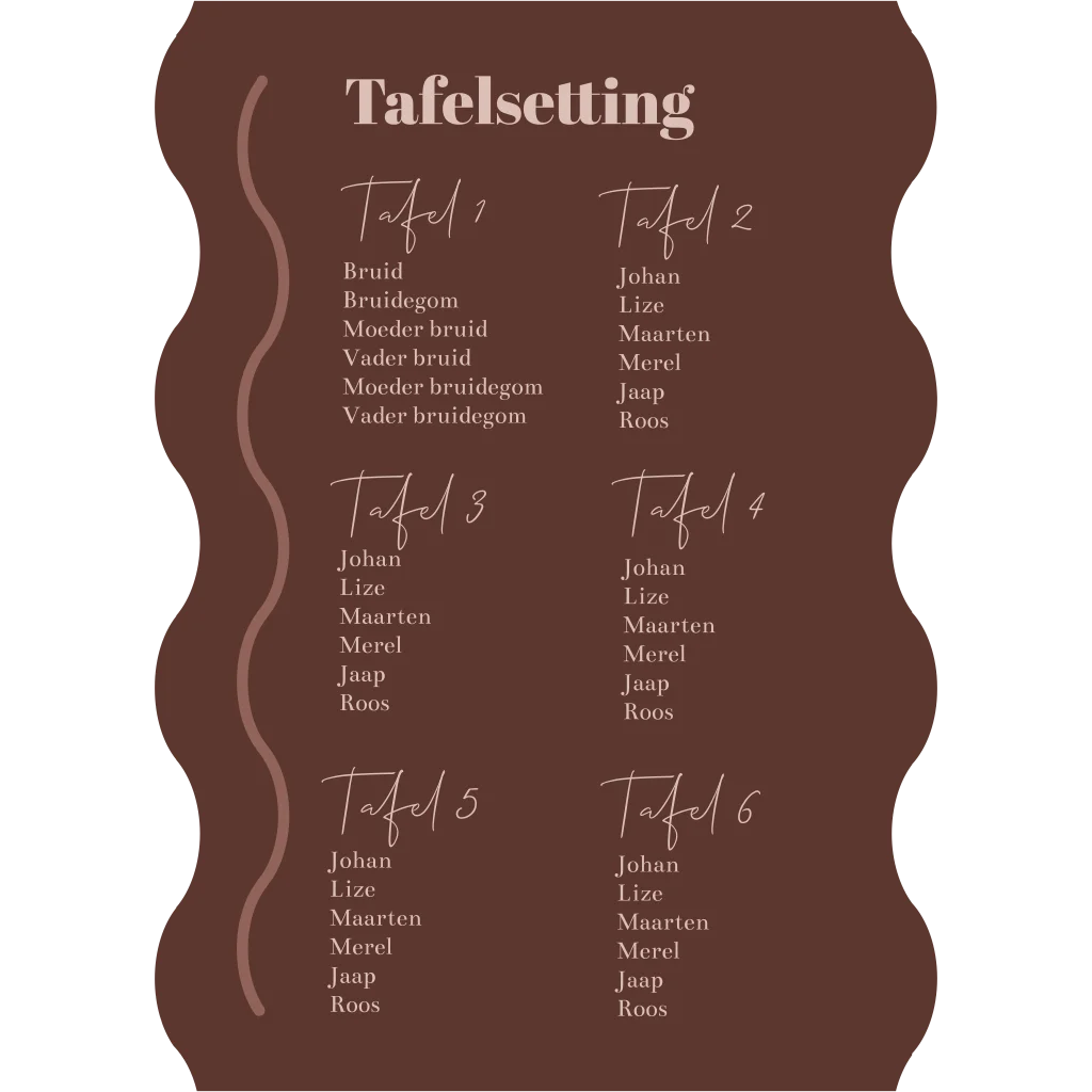 Op dit bord met golvende vormen kun je precies weergeven wat de tafelsetting is tijdens jullie bruiloft. Op de tafels zet je tafel nummers neer zodat de gasten precies weten aan welke tafel ze moeten gaan zitten.