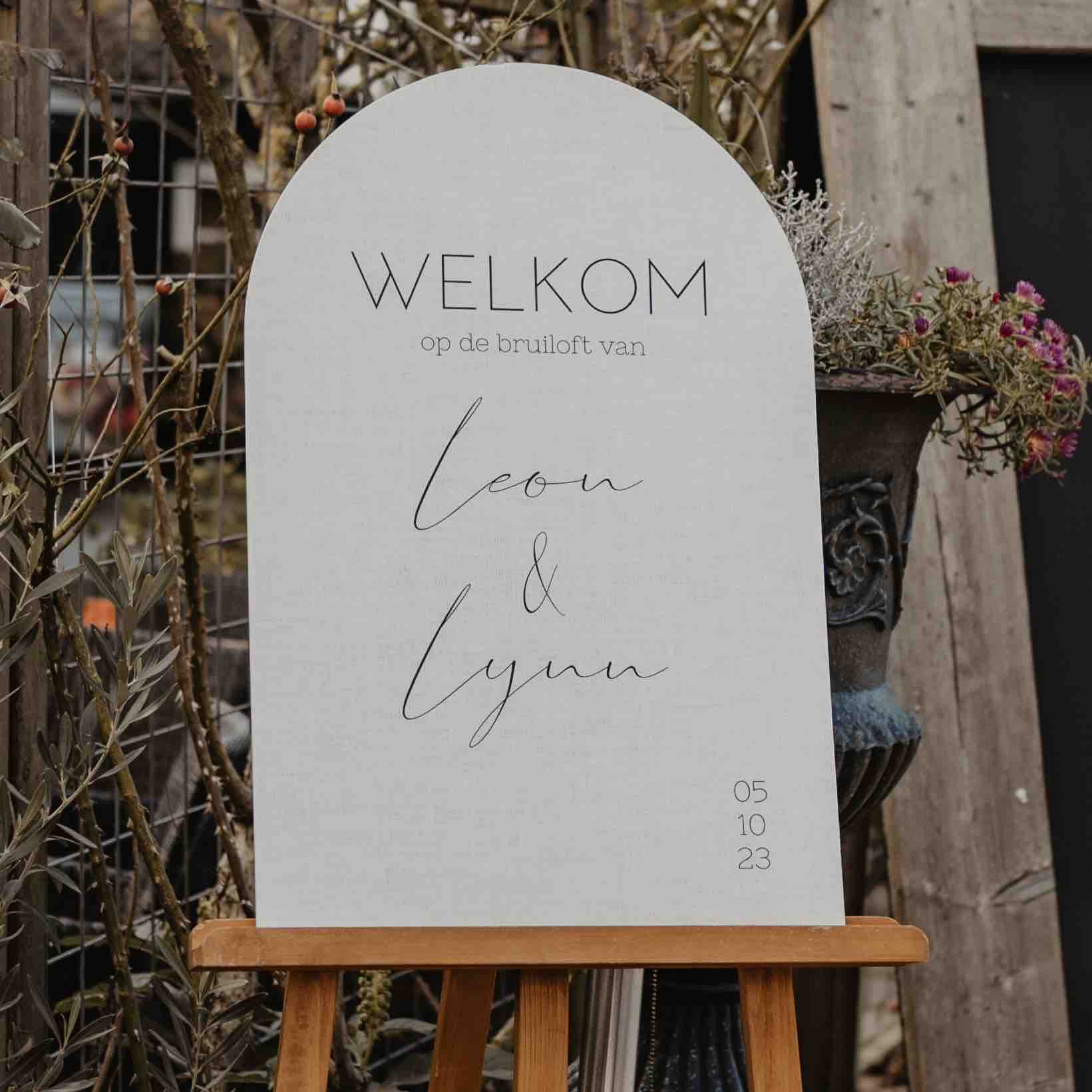 Welkomstbord bruiloft minimalistisch half rond beige ingang