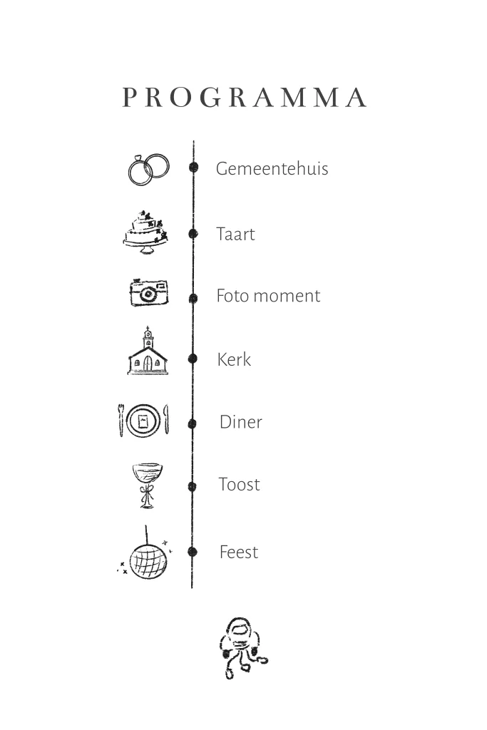 Hoe tof om een dagprogramma voor jullie bruiloft mee te sturen naar jullie daggasten zodat zij precies weten waar ze aan toe zijn op deze mooie dag.