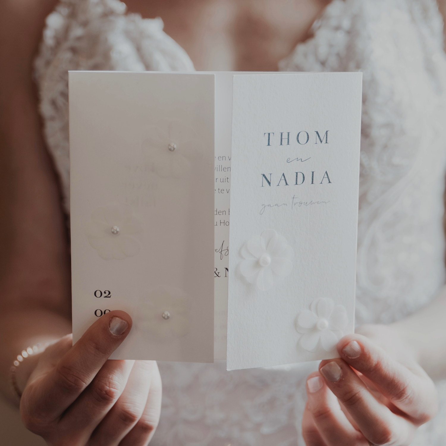 Klassieke luikvouw trouwkaart met witte bloemen erop