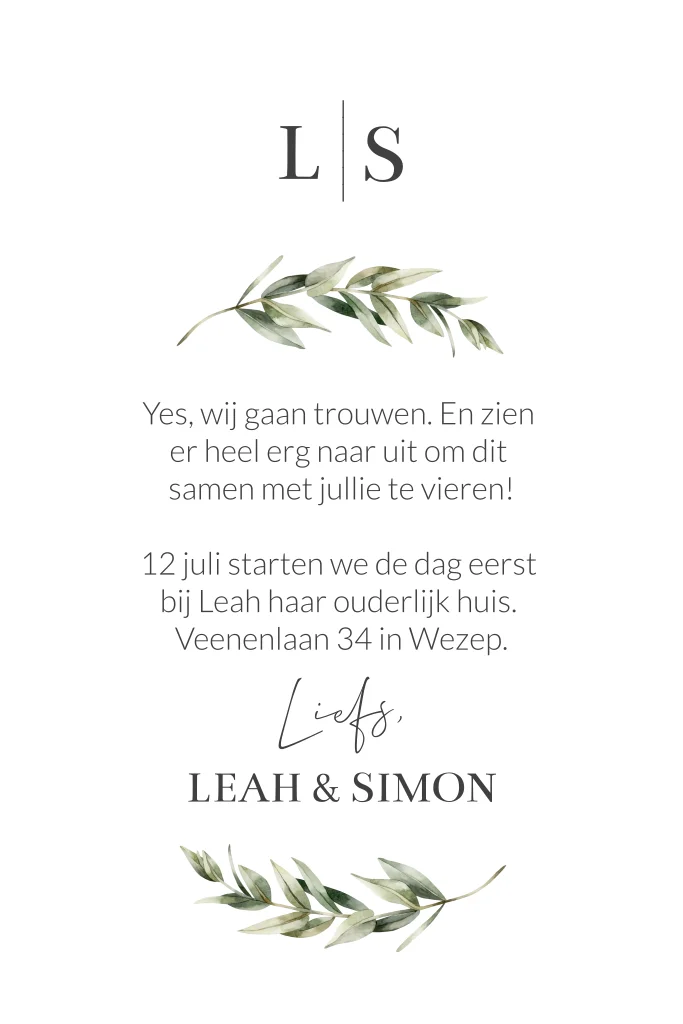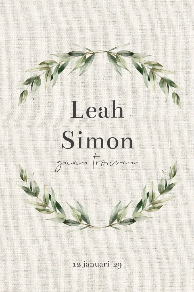 Deze klassieke trouwkaart met linnen achtergrond en watercolour olijftakjes kun je zelf helemaal aanpassen naar wens en smaak. Leah & Simon
