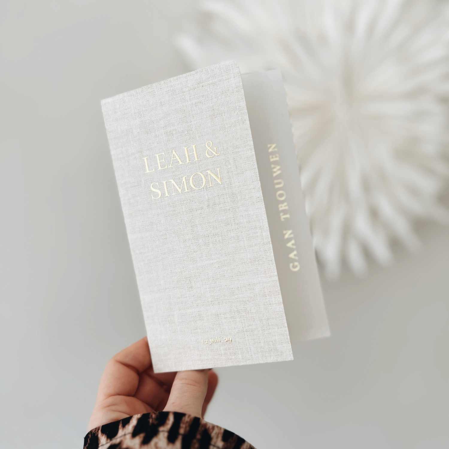 Een klassieke trouwkaart in Linnen look voorkant en witte achterkant.