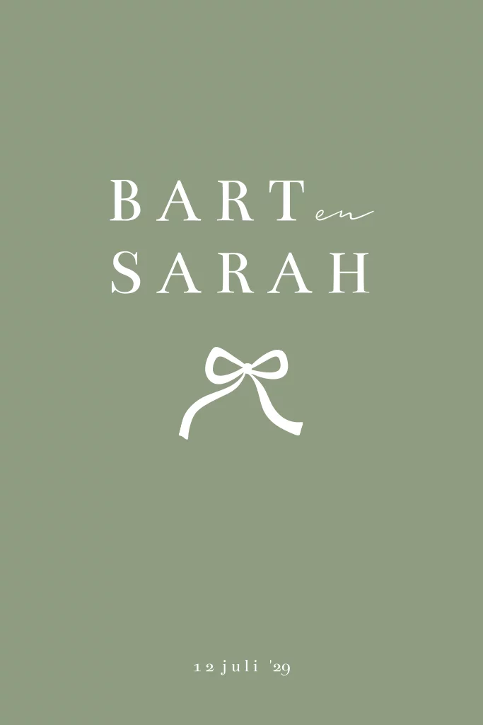 Deze klassieke minimalistische trouwkaart met een strik voorop kun je zelf aanpassen naar wens en smaak. ook de olijfgroene achtergrond.