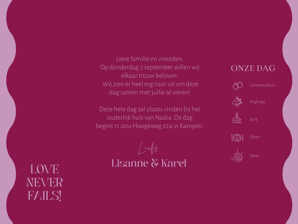 Luikvouw trouwkaart paars roze met golvende vorm
