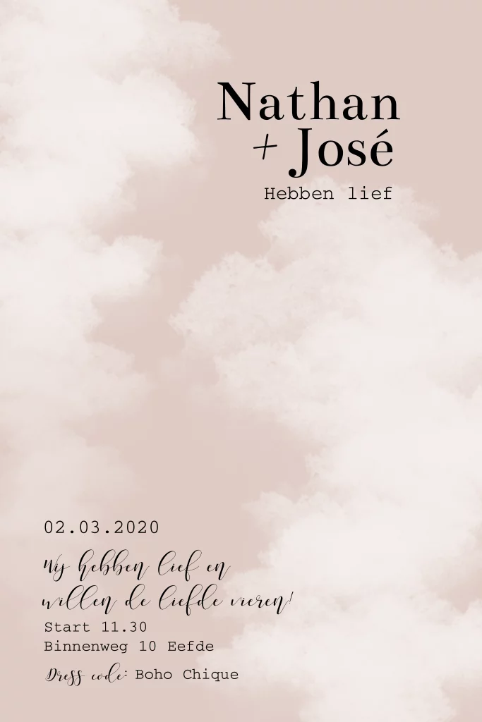 Een minimalistische trouwkaart met roze achtergrond en witte wolken. Alles kun je aanpassen. Zo maak je een unieke kaart voor jullie dag. Bekijk ook de rest van de bijpassende huisstijl.