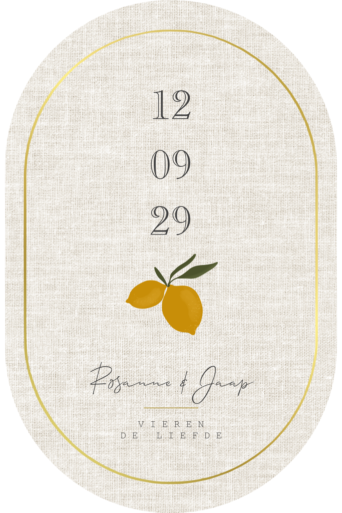 Ovalen trouwkaart met citroentje en linnen look met goudfolie
