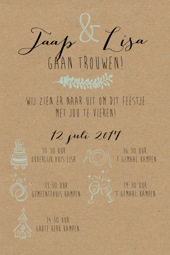 Een toffe toevoeging is een foto van jullie als ste op de achterkant van de kaart. Check voor inspiratie zo_joann op Instagram.