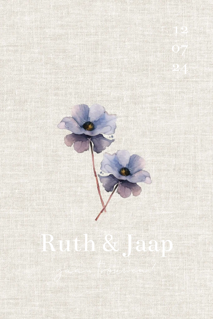 De klassieke trouwkaart met linnen achtergrond en paars blauwe watercolour bloem en tekst in roséfolie. Ruth & Jaap