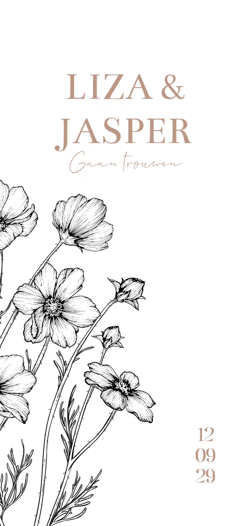 Botanische trouwkaart met lijntekening van klaprozen lijntekening. We kunnen je helpen bij een huisstijl voor jullie bruiloft! Liza en Bram